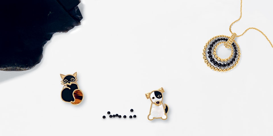 Onyx is a deep, rich black variety of chalcedony. The Maison selects stones with a fine, homogeneous texture. Polishing enhances the sparkle of this stone so that the surface reflects light like a mirror. For its creations, Van Cleef & Arpels carefully selects extremely pure stones in intense, uniform hues. The colors of onyx are often harmonized by lapidaries using specific techniques to provide consistent undertones.