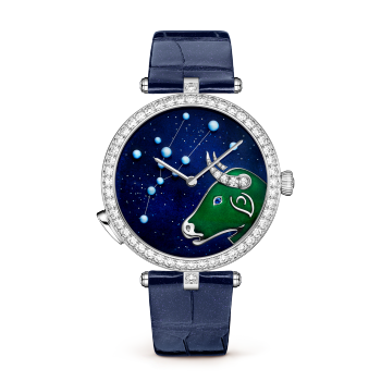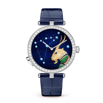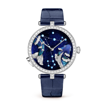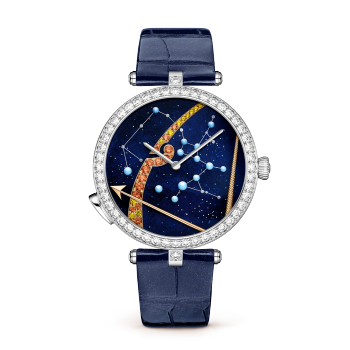 An invitation to live life to the rhythm of the cosmos, the twelve women’s Lady Arpels Zodiaque Lumineux models recreate the twinkling of the stars through an exclusive on-demand light-up model. Delicately sculpted and gem-set by hand, the signs of the zodiac contrast with a sparkly blue enamel background, echoing the celestial sky. Gemini, an air sign, is traditionally associated with sociability and dynamism.