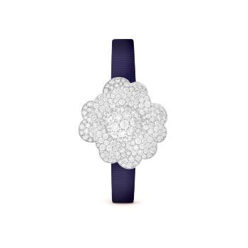 In the Van Cleef & Arpels Garden, High Jewelry watches form a garden filled with delicate nuances like a precious ode to the beauty of flowers. The Primerose Secrète watch reveals a dial at its heart and is worn on a pink grosgrain bracelet or a rhodium plated 18K white gold and 18K yellow gold clip.