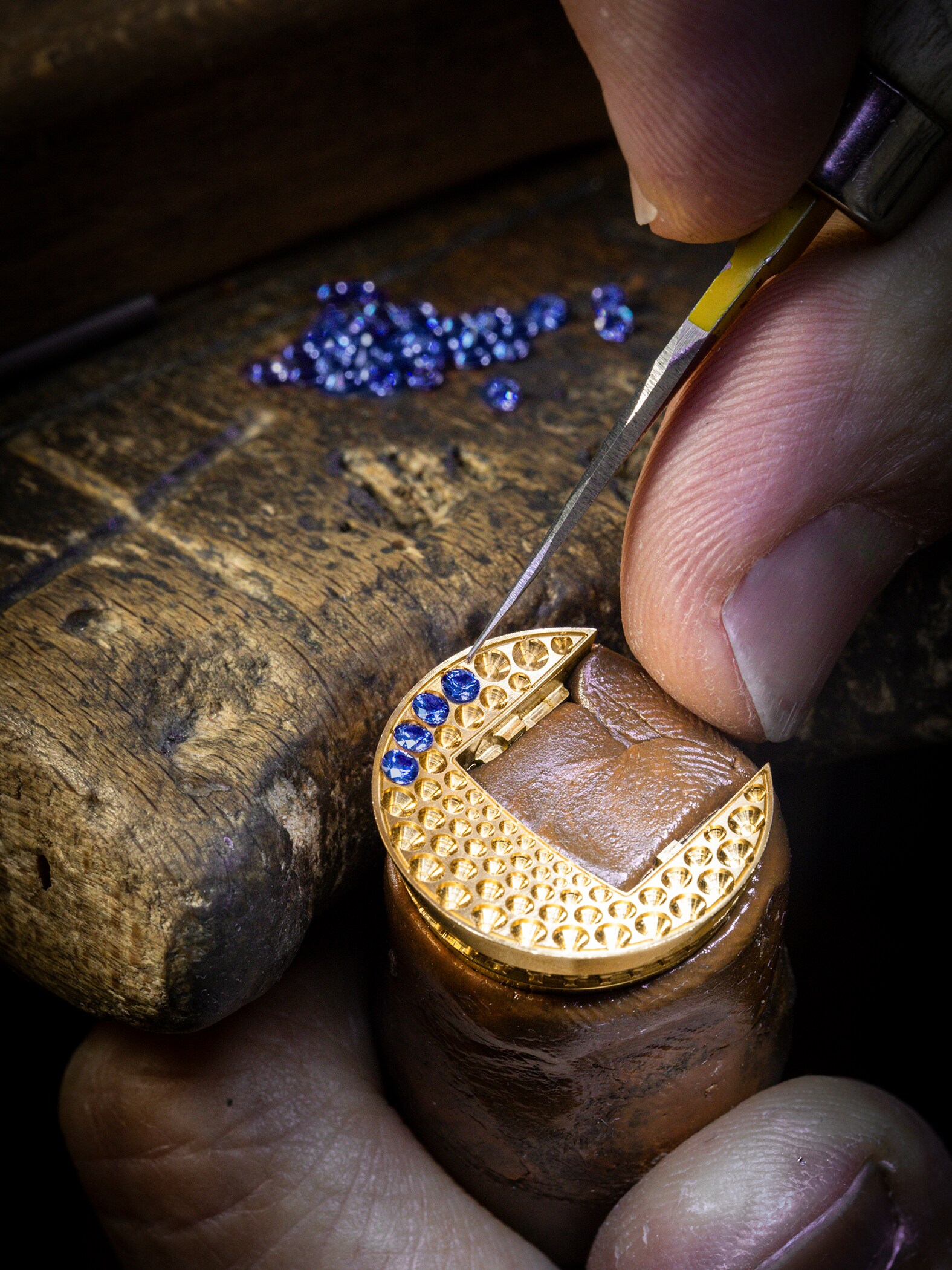 The À Cheval watch is primarily inspired by the Art Deco White Period of the 1930s. The artistic movement is defined by geometric lines and abstract shapes. This creation reflects the remarkable High Jewelry expertise of Van Cleef & Arpels which uses various gem-setting techniques, carefully selected to intensify the brilliance of its diamonds.