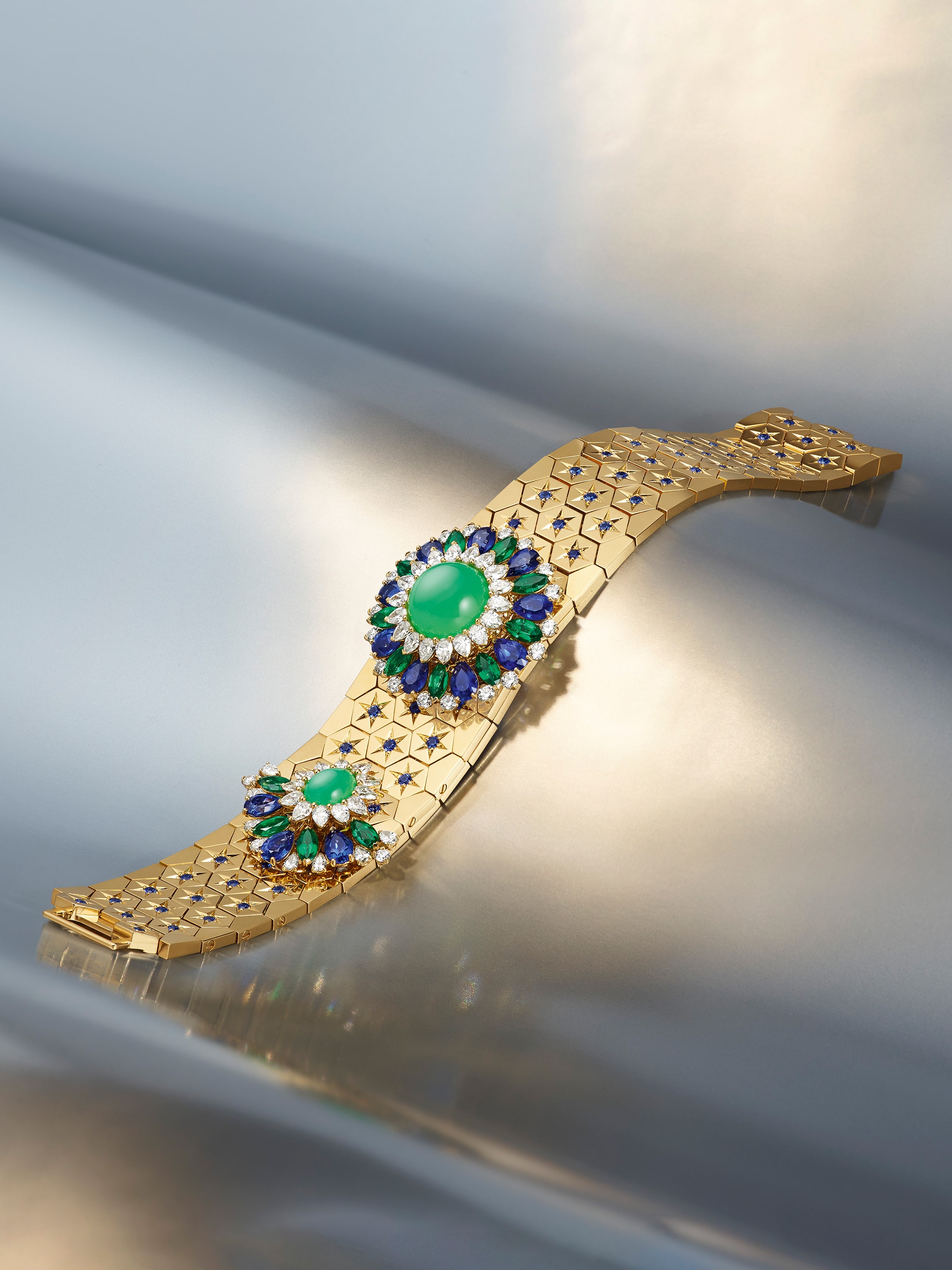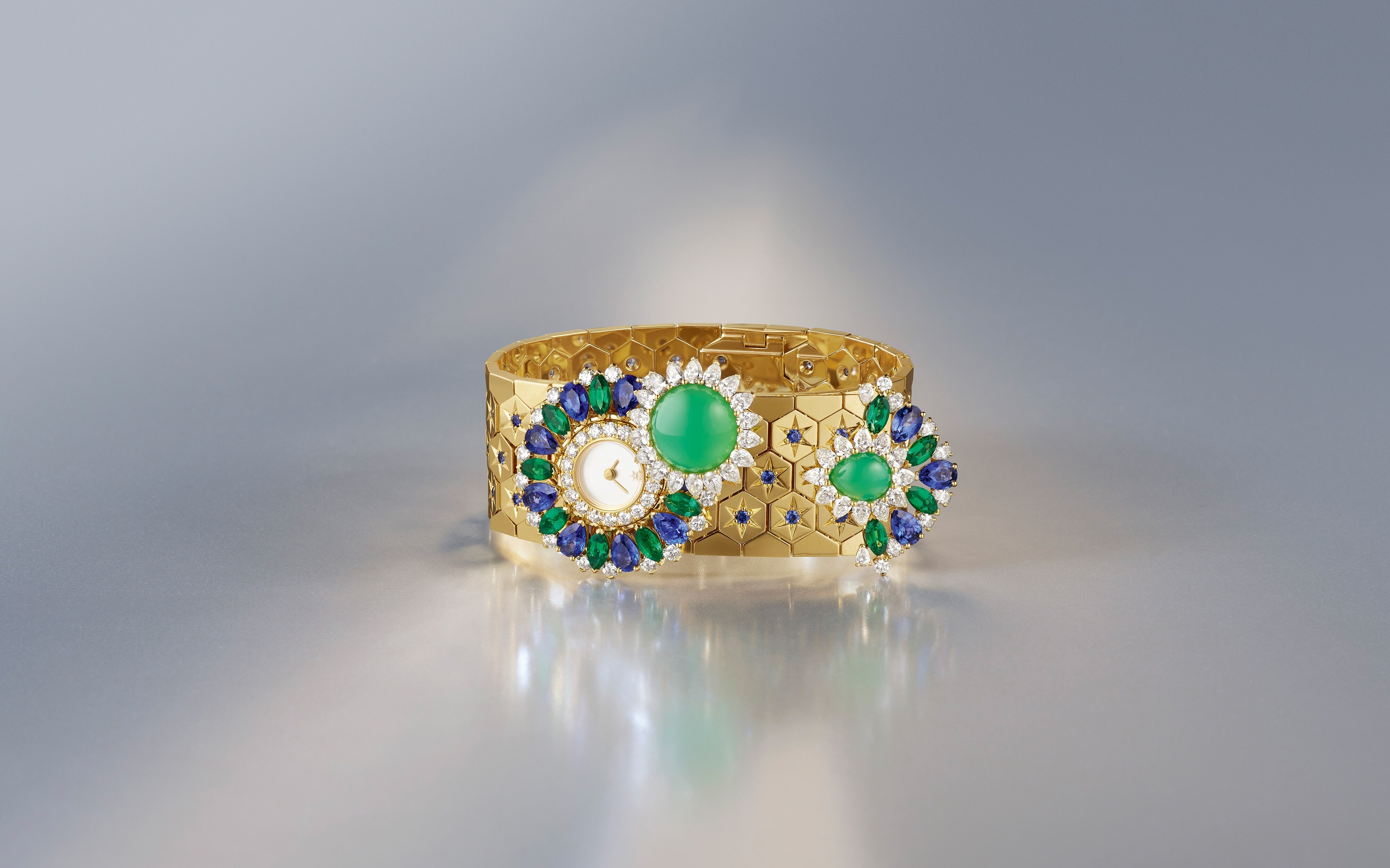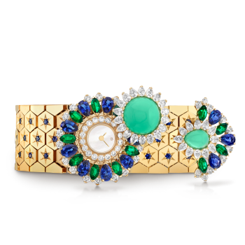 Revisiting the style of the Ludo bracelets designed in the 1930, five watches display the passage of the hours with the Ludo Secret models. Bringing together different materials and colors of gold, the creations are made up of hexagonal links. Adorned with precious stone – a ruby or sapphire – in star setting at their centers, they form a glittering constellation around the wrist.