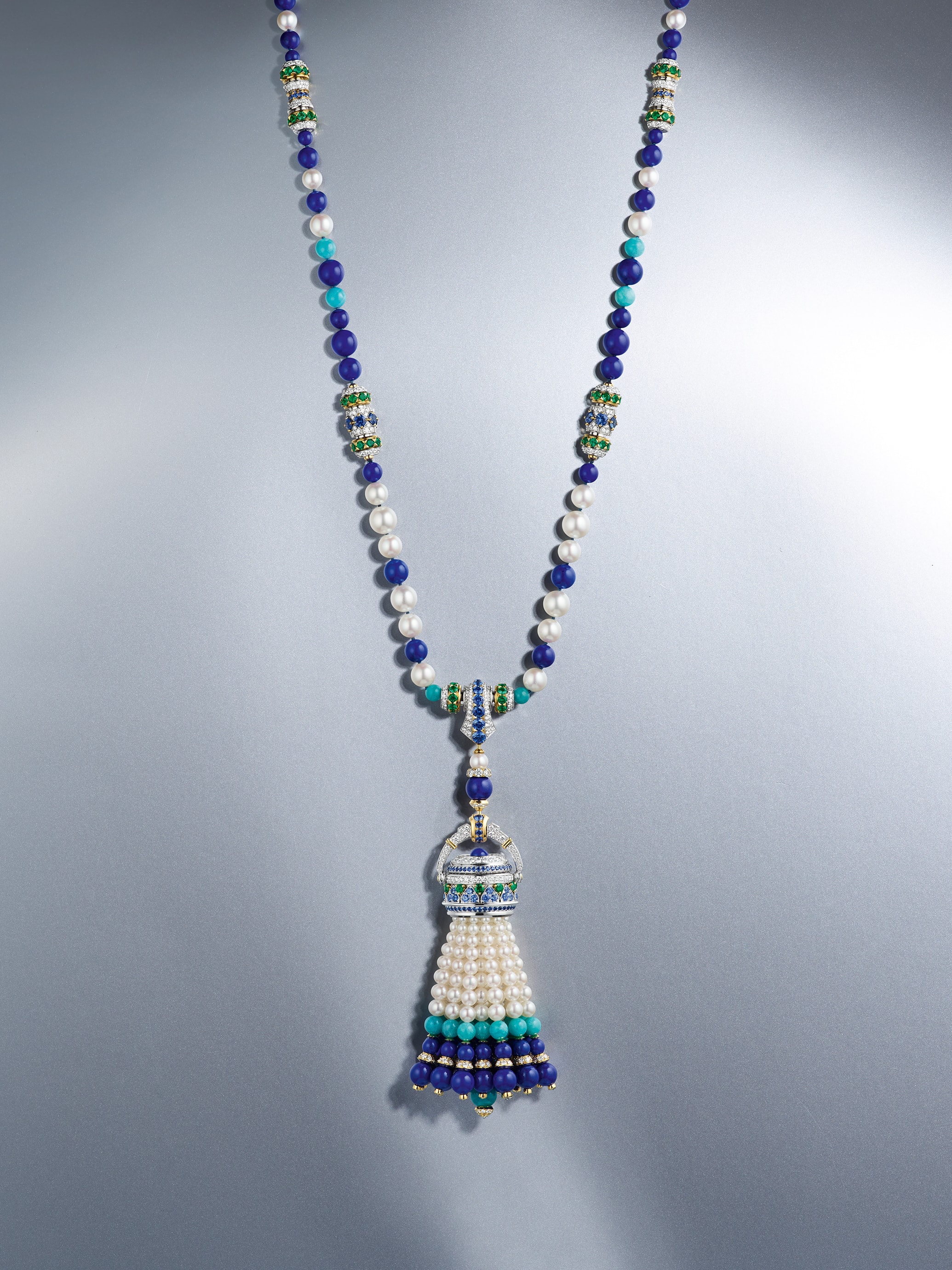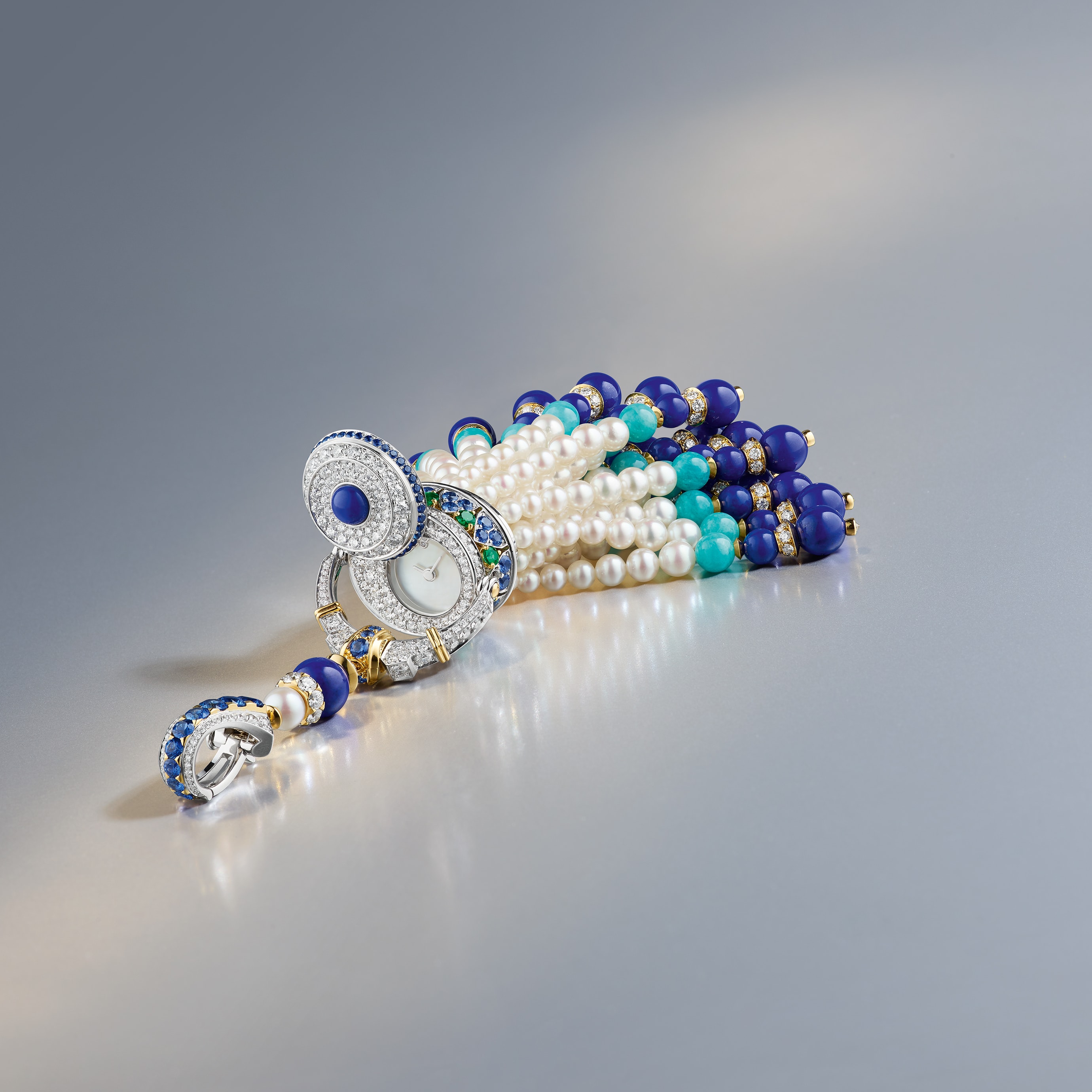 Emblematic of the world of couture, a tassel enlivens each necklace with lines of pearls and multicolored beads. Gracefully accompanying its wearer’s movements, it harbors a delicate dial in mother-of-pearl, concealed differently according to the model. In keeping with one of the Maison’s cherished traditions, the pieces can be transformed and worn in several ways, to suit any mood.