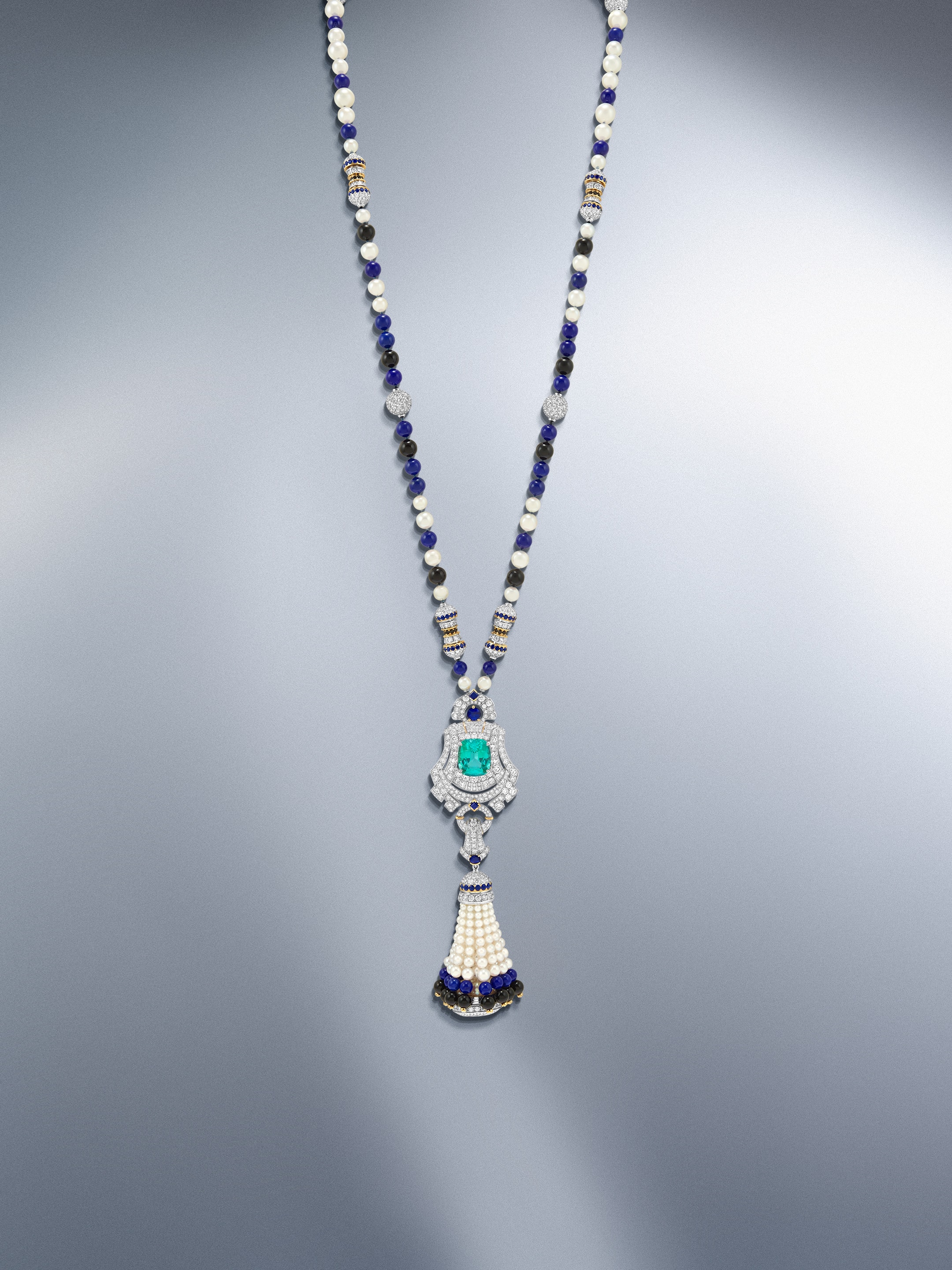 The Maison is unveiling new creations that combine elegance with metamorphosis: the Pompon secret long necklaces. Inspired as much by the fluid lines of the jewelry of the 1920s as the dazzling color combinations of the 1970s, these unique pieces associate white cultured pearls with a variety of precious materials.