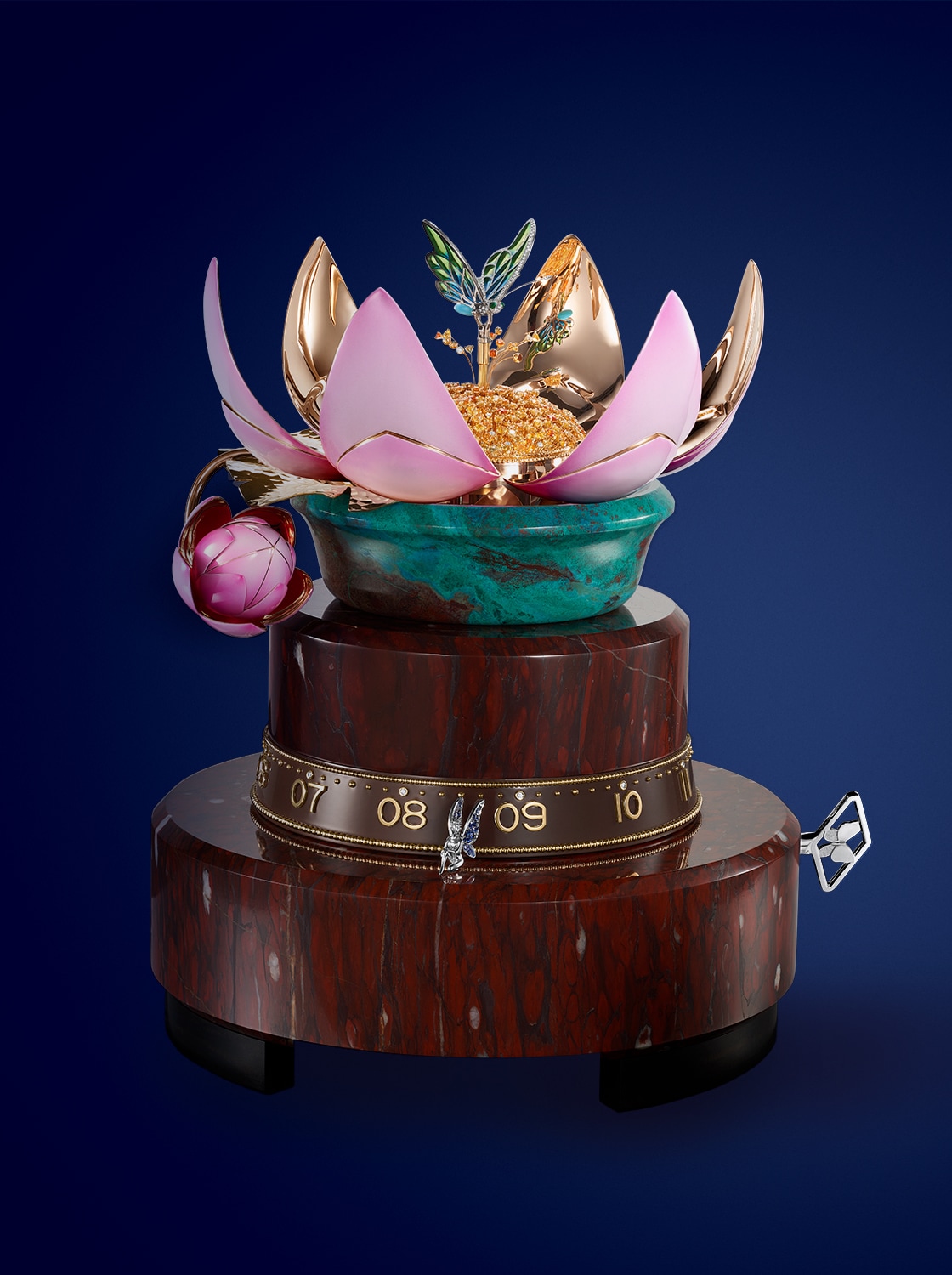 The Floraison du Nénuphar automaton fits in a series of pieces inspired by nature and introduced by the Maison in 2022. This new creation displays the opening of a flower on demand, revealing a butterfly inside.