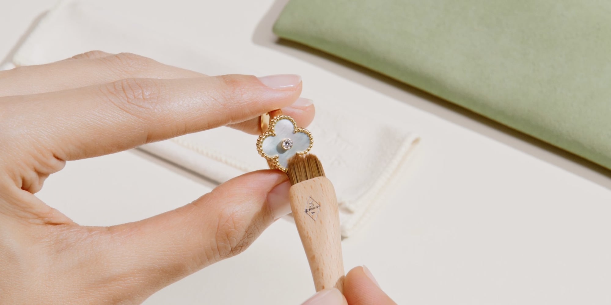 Van Cleef & Arpels梵克雅宝感谢您的信任,并衷心希望您的作品能伴您度过一个个幸福瞬间,带来无穷喜悦。为便于保养,在购买时已为您附赠清洁工具。由再生棉制成的收纳袋中备有软刷和麂皮布。这两种工具既可用于干洗,也可以配合肥皂水进行清洁,因此可用于Van Cleef & Arpels梵克雅宝的所有珠宝作品。