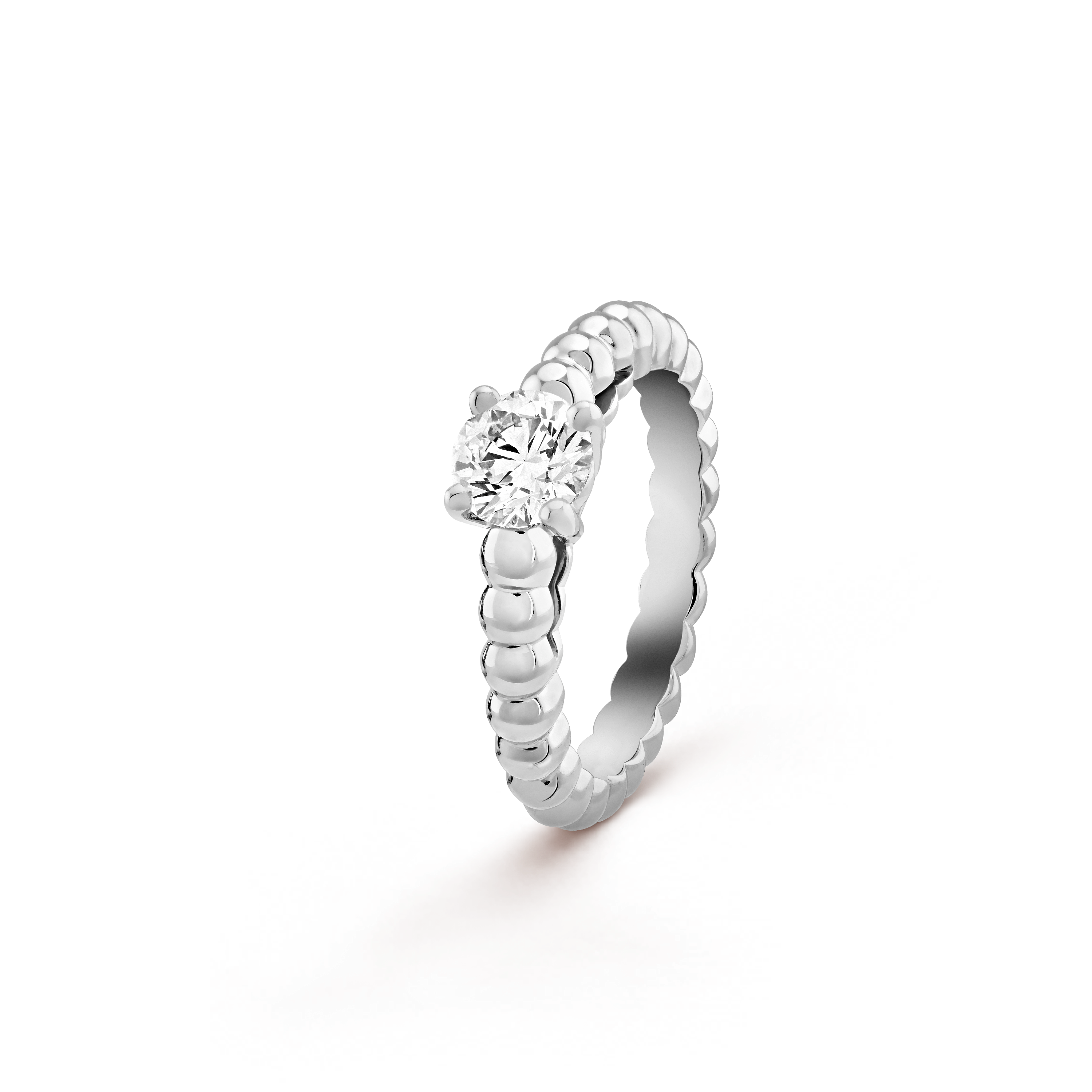 Perlée®钻石戒指呈现圆润的线条,颂扬世家的标志性工艺:以金珠装饰勾勒作品的轮廓,尽显珠宝柔美俏皮的格调。闪闪发光的珠饰戒指映衬华美的中央钻石。