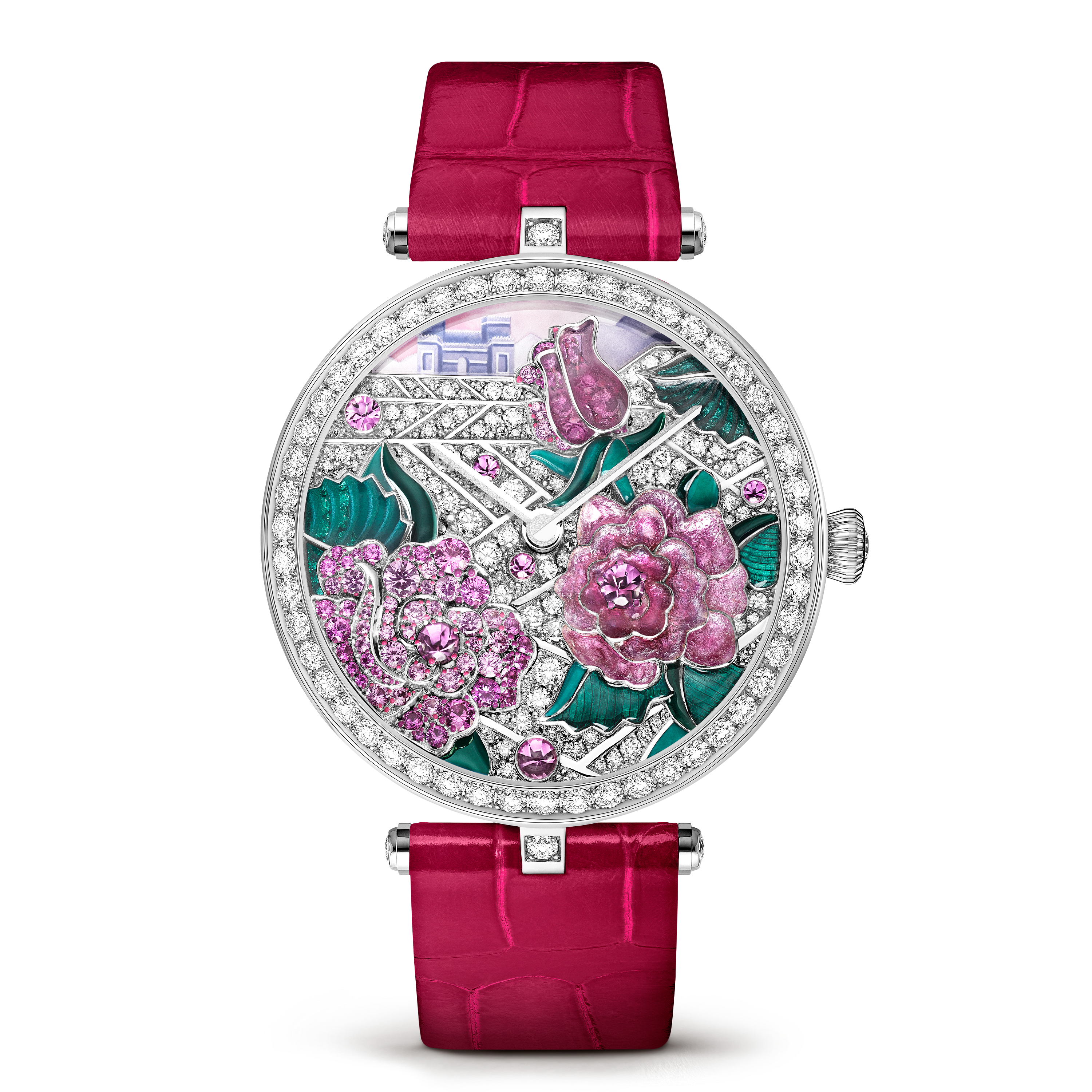 在Poèmes en Fleurs Extraordinary系列中,Van Cleef & Arpels梵克雅宝以全新方式演绎爱情主题。Lady Arpels Poème Rose腕表的灵感源自Guillaume Colletet的“La Rose”或“玫瑰”,摘自La Guirlande de Julie(朱莉的花园),17世纪法国爱情诗的手稿。波斯帝国被公认为玫瑰的原产地;它以传统波斯特色建筑呈现于腕表的表盘上。