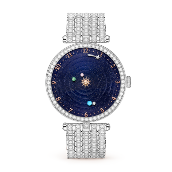 Midnight Planétarium腕表诠释宇宙姿态,呈现星体的运行轨迹。群星进入眼帘,并以流星指示时间。一颗幸运星邀请佩戴者在此满天繁星的表盘上记录下幸运日。表盘以微观方式重现可在地球用肉眼观察到的五大行星:水星、金星、火星、木星及土星。透过独家模块,每颗星球在其各自的转盘上,均以其真实的速度转动。