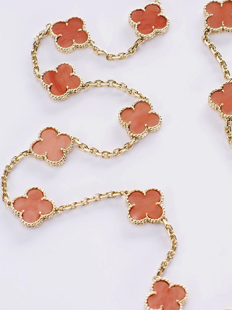 雅克·雅宝(Jacques Arpels)曾言:“心怀幸运之愿,方能成为幸运之士。”Alhambra系列四叶幸运图案,幸运的象征。它的创意灵感源自四叶草。首款长项链采用褶皱黄K金,于1968年优雅问世。多年来,世家不断推陈出新,以多样化的材质、颜色和款式丰富系列。