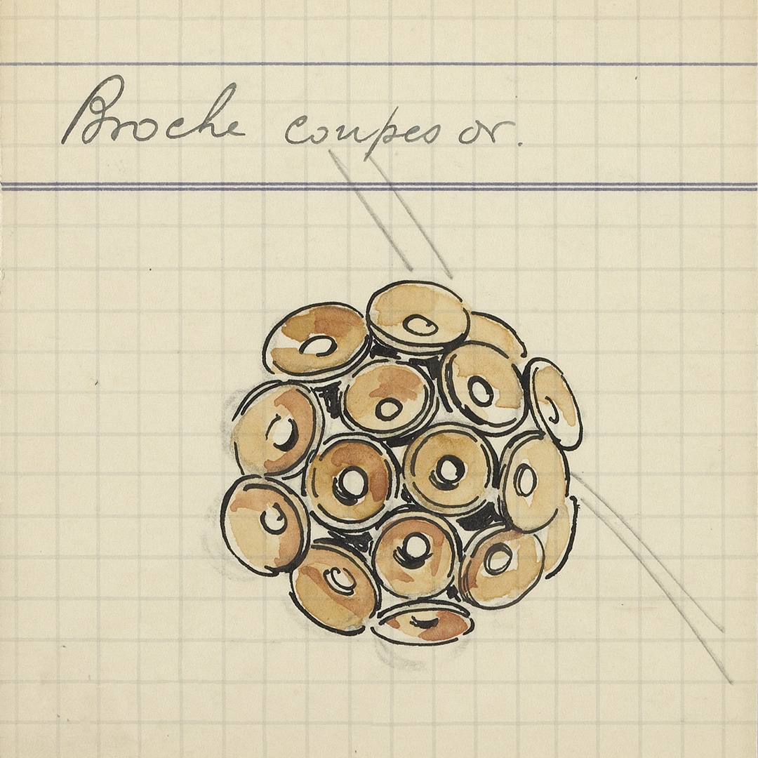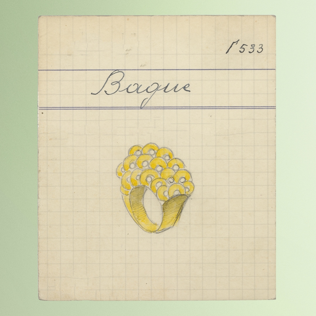 1940年代,世家对这些金色圆盘进行了多元化诠释:可置于弧拱形戒指、奢华项链、闪耀Bouquet胸针之上组合佩戴。这些主题镶嵌着红宝石、绿松石或钻石,赋予了同时期世家设计的芭蕾舞演员的芭蕾舞短裙优雅格调。1942年,这些主题在“Coupes or”胸针和耳环中大放异彩,随后世家于1943年推出了珍贵的“Fourragères”系列。