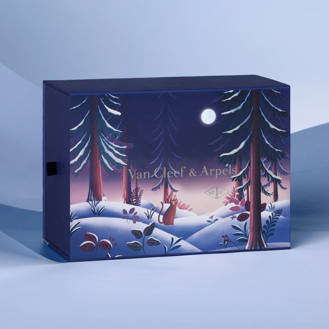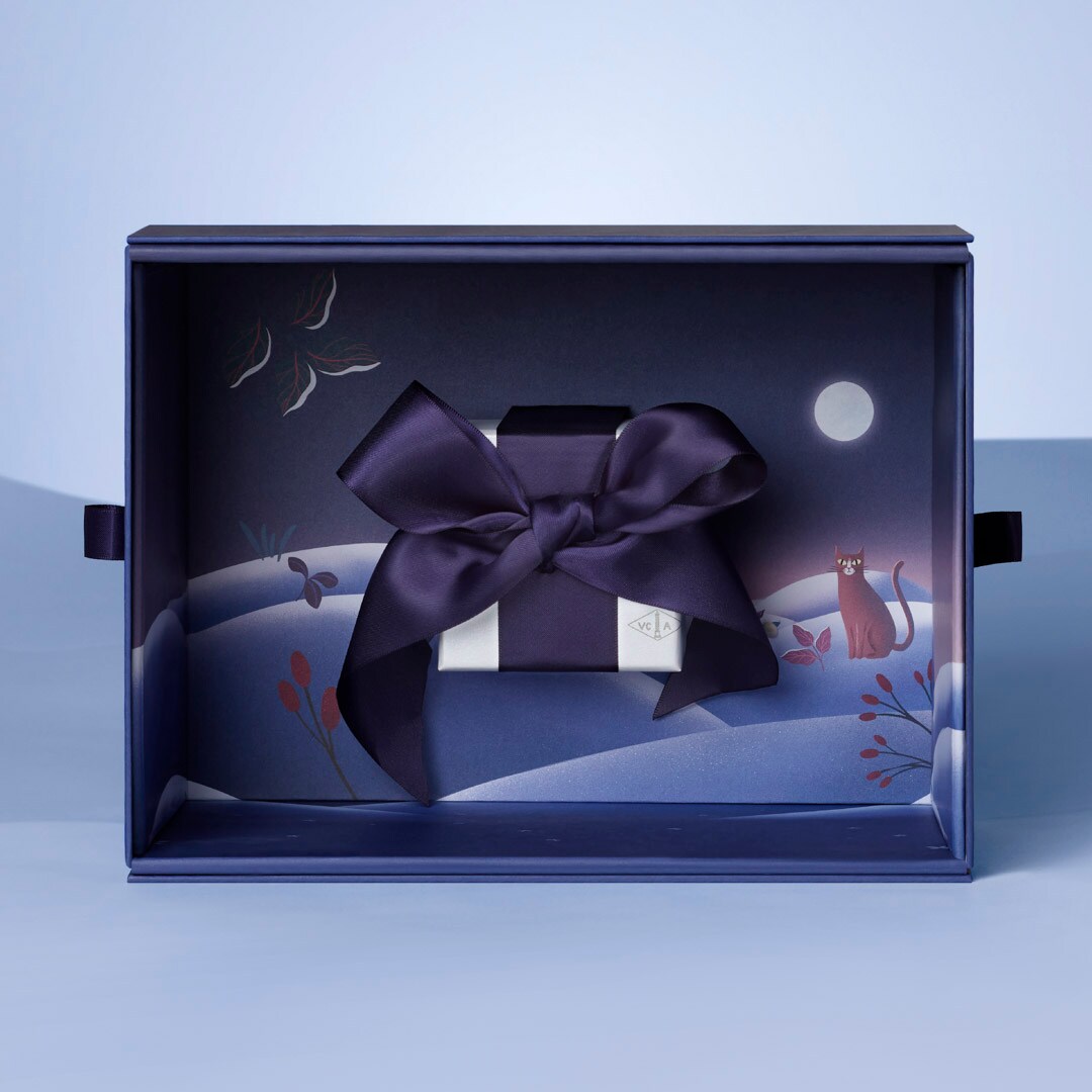 值此璀璨佳节,Van Cleef & Arpels梵克雅宝推出冬季限定艺术包装,为您的臻礼更添迷人魅力。*为此,Burcu & Geoffrey特别设计了蓝色礼盒,盒身描绘皑皑白雪的冬日绮境,宛如诗意静谧的冬夜。每件作品均采用优雅礼盒悉心包装,并附有正品证书以及世家标志性包装袋。