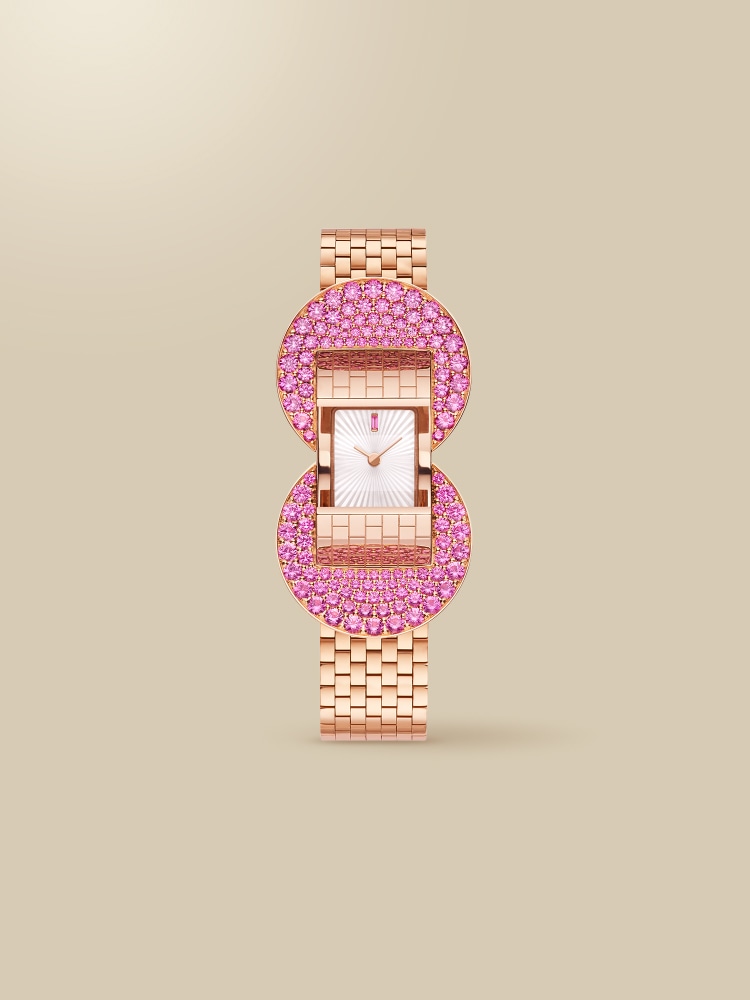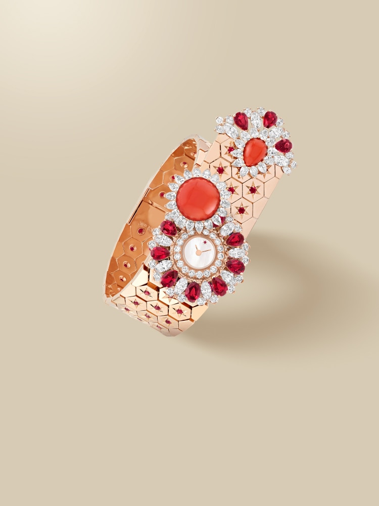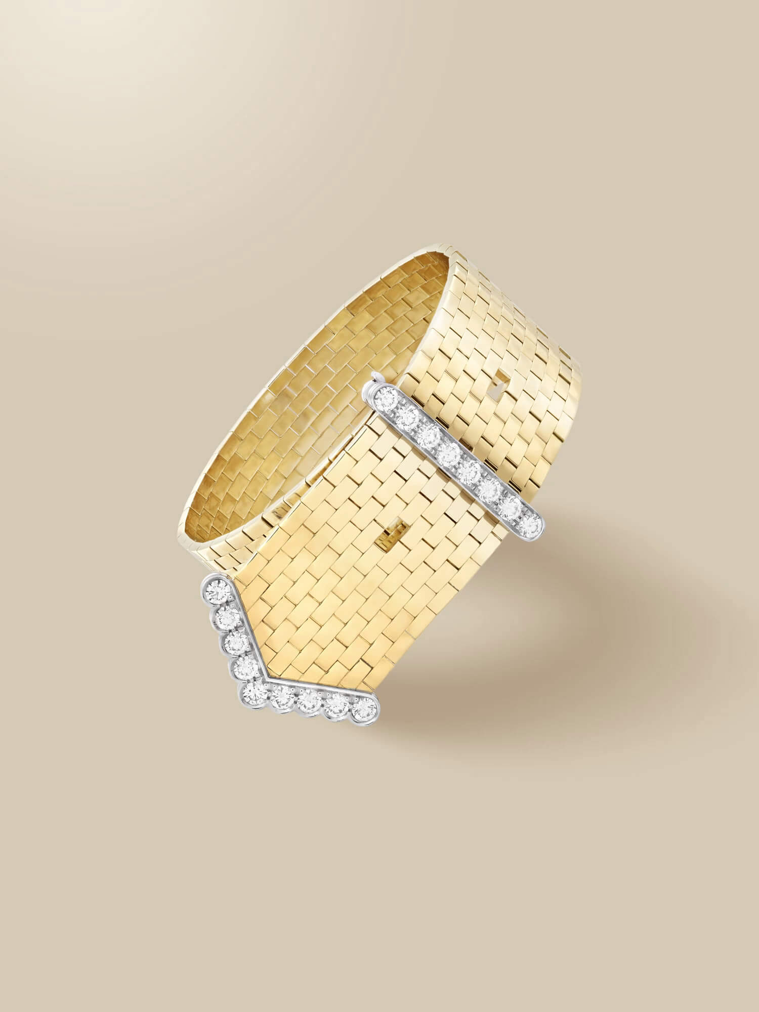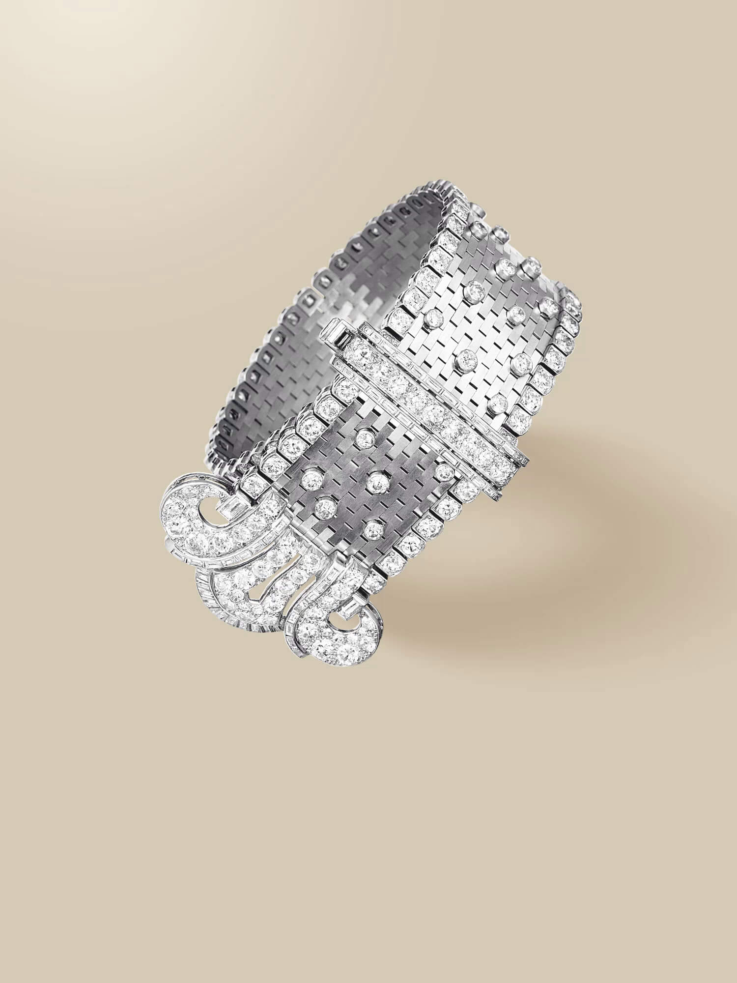 通过Ludo手镯,Van Cleef & Arpels梵克雅宝将一条普通的腰带变身为呈现多种变化的珠宝作品。它的铰接结构复刻了皮带的全部功能,配有镶嵌宝石的扣环,有时可装嵌一枚珍贵的秘密腕表。