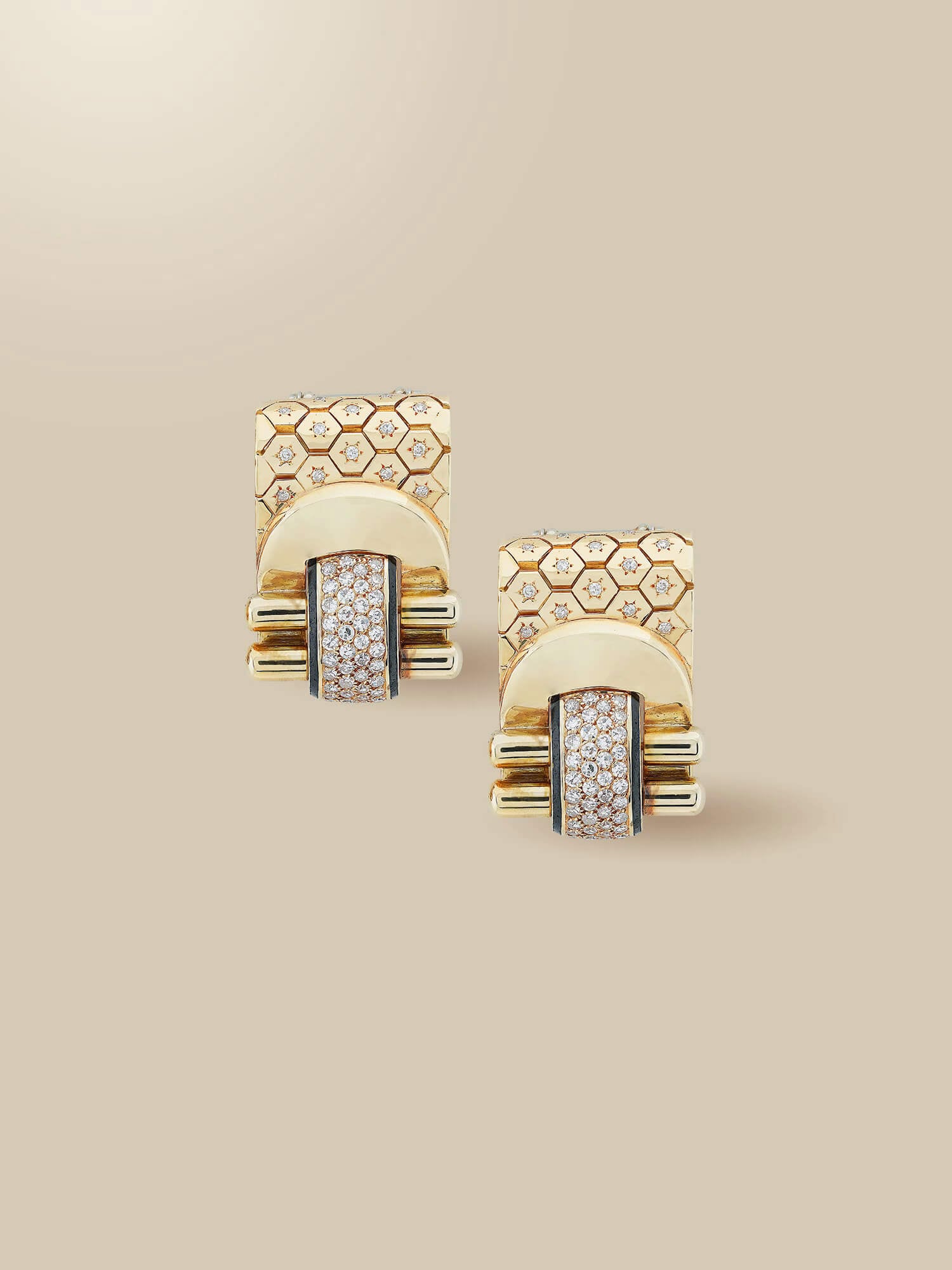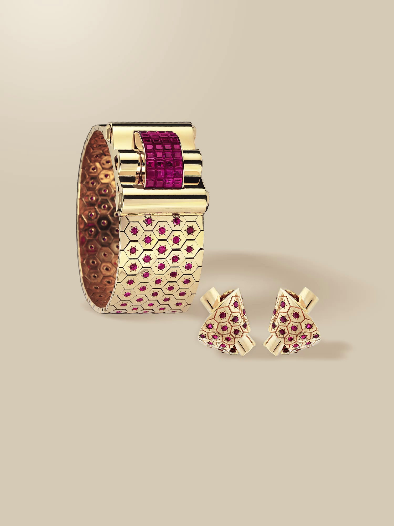 在手镯、腕表、戒指、耳环或胸针中,Ludo系列作品上复杂精细的网格十分瞩目。精美夺目的块状图案巧妙融合可反射光线的微小抛光金色长方形。“蜂窝状”设计和谐地将小六边形连接在一起,中央有时会装饰星形镶嵌宝石。从1945年起,Pampilles手镯以蛇形链和流苏为Ludo系列带来全新亮点。