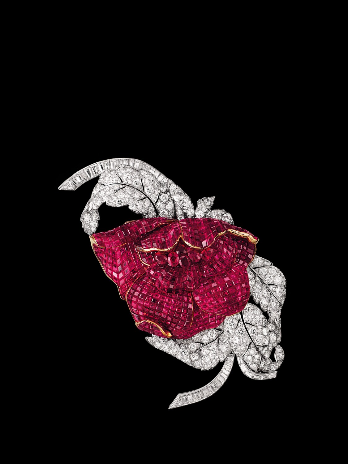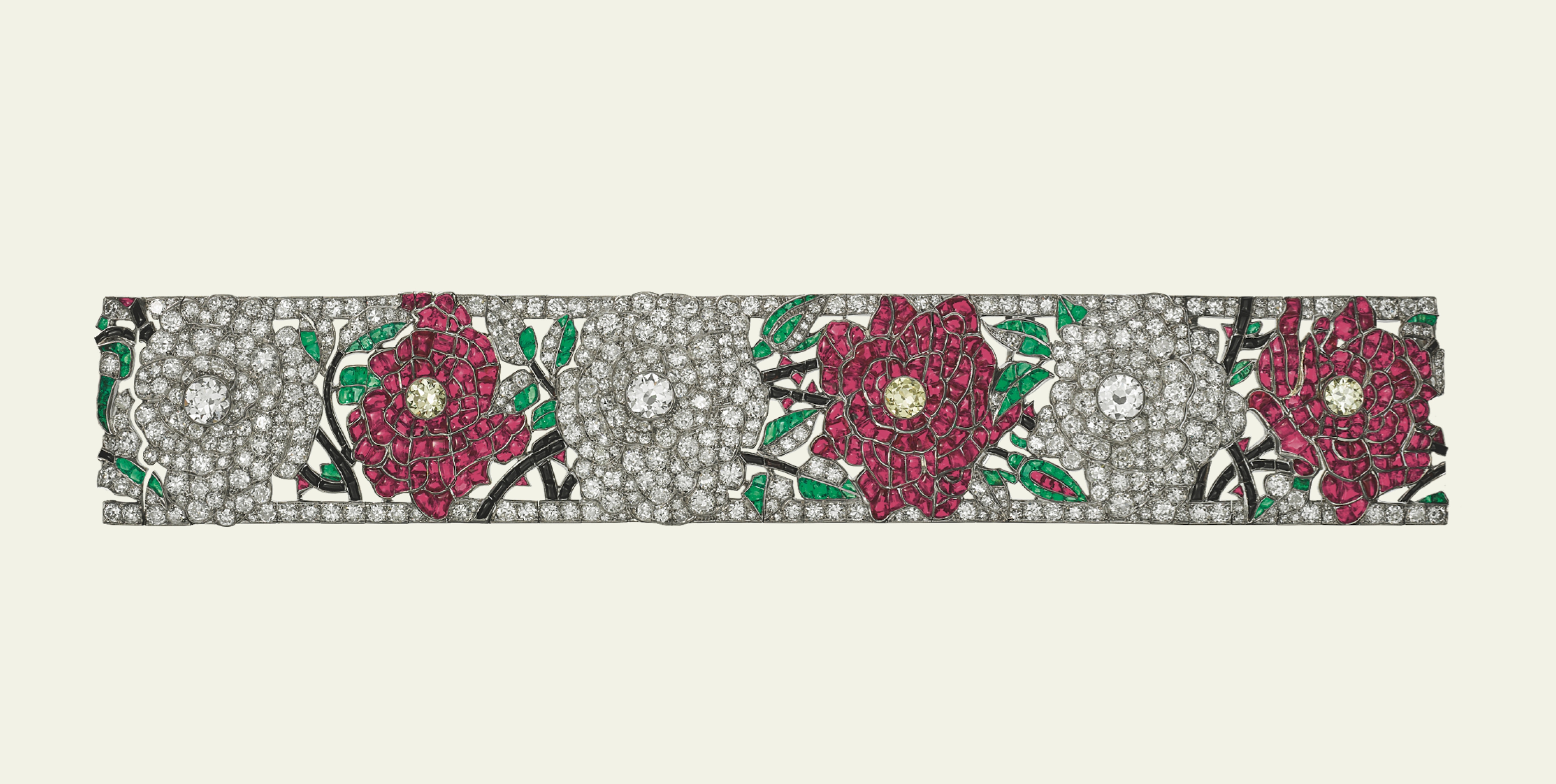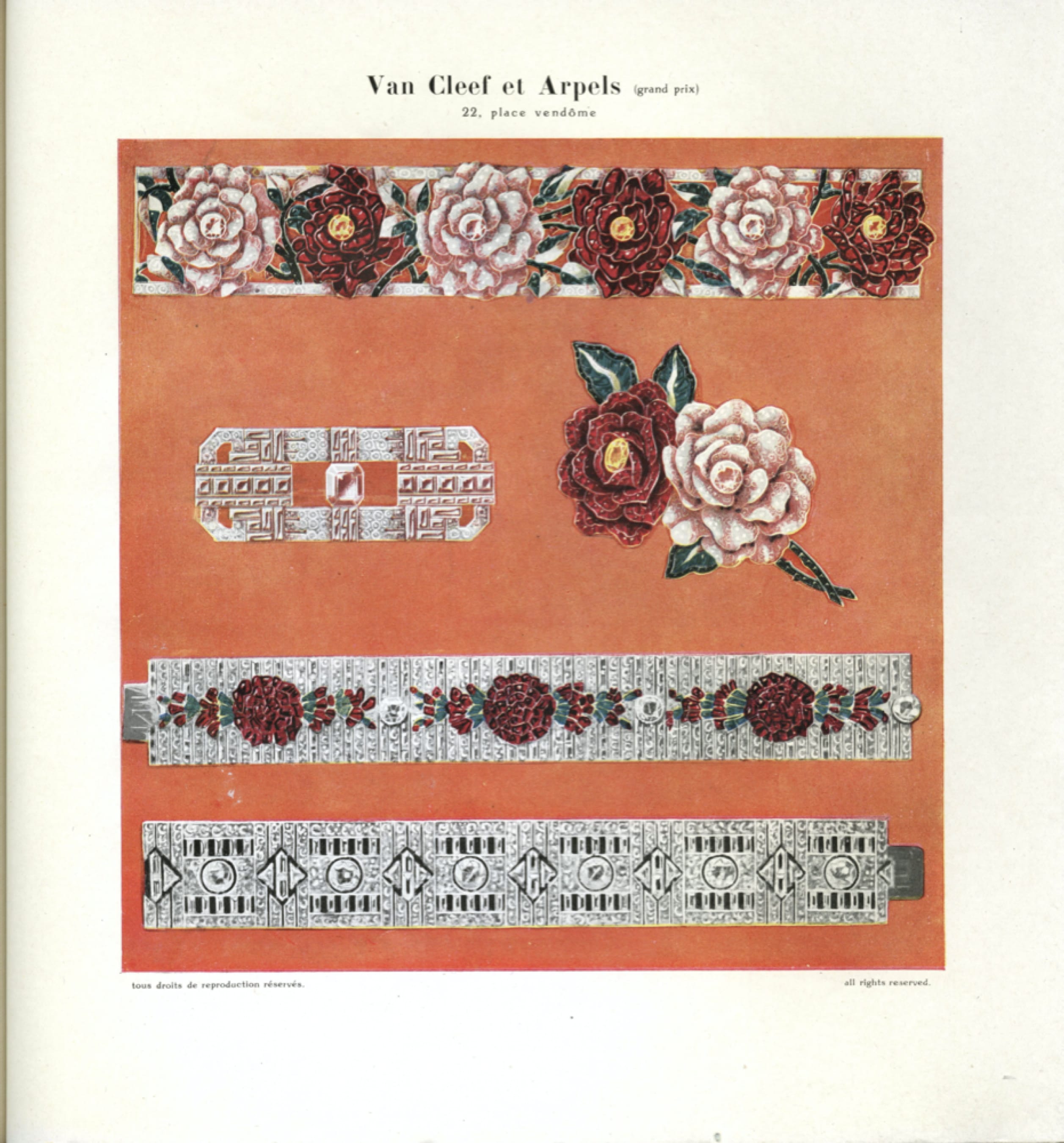 Van Cleef & Arpels梵克雅宝的花卉交织设计、红色和白色玫瑰手镯,在巴黎举办的国际装饰艺术及现代工艺博览会上荣获特奖。