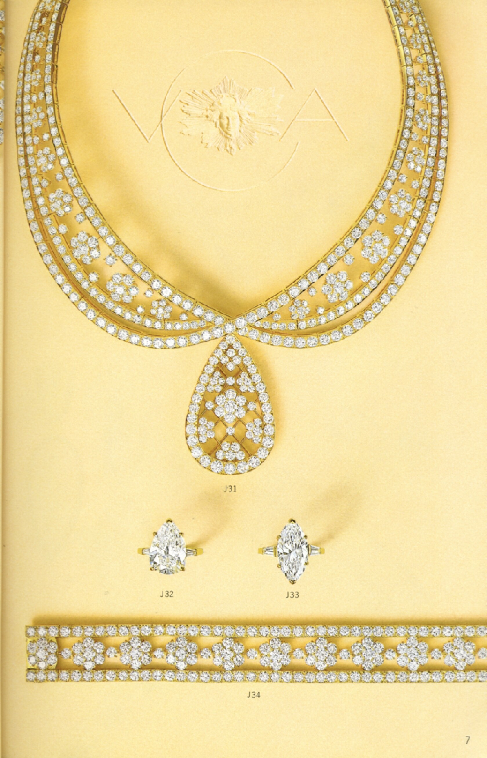 世家从高级定制时装世界中汲取灵感,打造出Col Claudine项链,它以精细金色织物打造,并装饰钻石花卉图案。