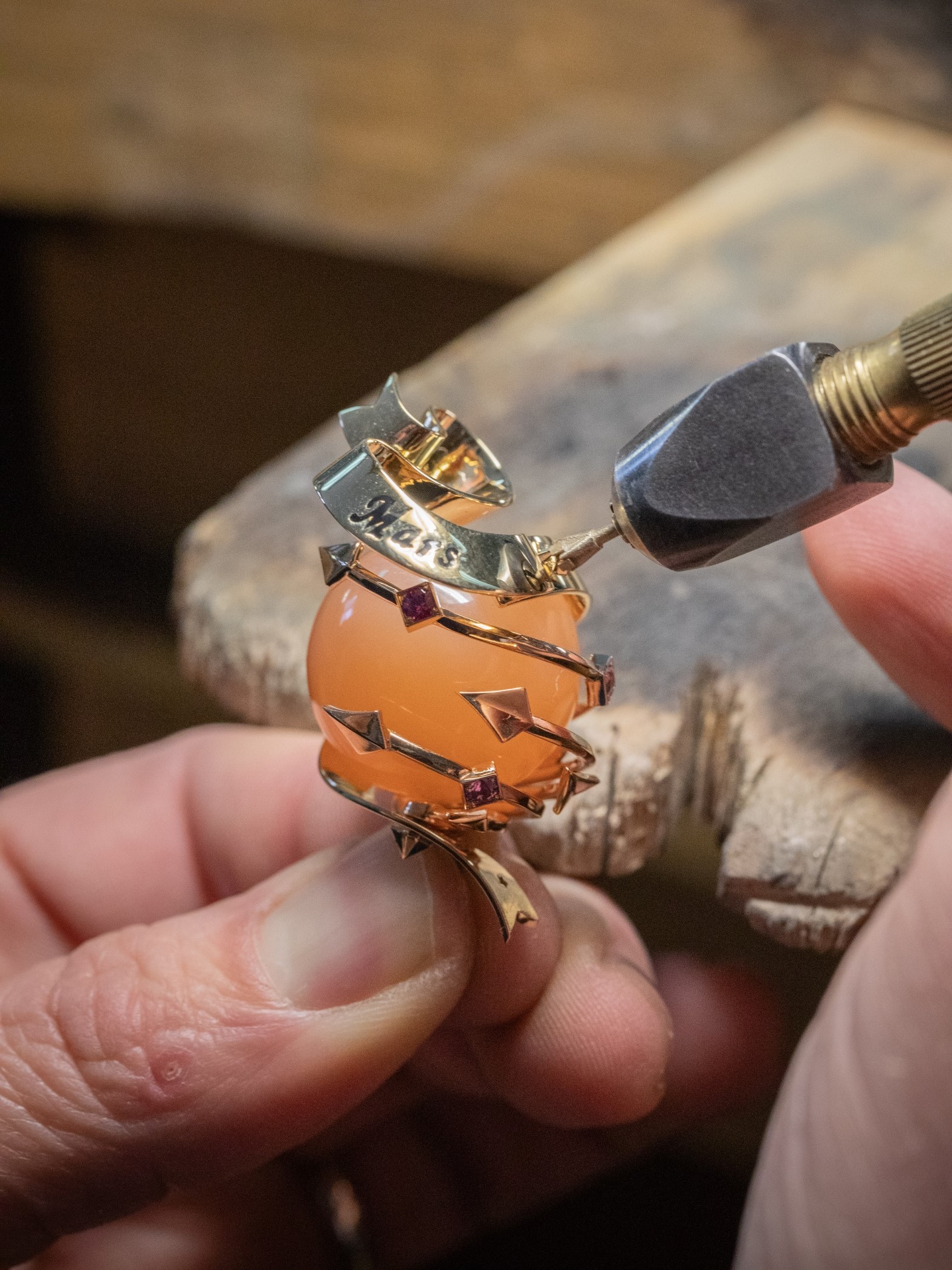 围绕太阳的立体行星各自沿轨迹运行,每一颗均饰以一条金质缎带,其上镌刻以星体之名,设计灵感源自18世纪天文图。神话意象为这幅瑰丽画卷赋予点睛之笔:贝壳象征金星,箭矢寓意火星,而闪电则昭示木星的威严力量。水星以玉髓呈现,缀以白K金与深浅不一的蓝色蓝宝石;金星则以柔和细腻的粉晶为装饰,搭配玫瑰金和粉红色蓝宝石。绿色碧玉象征着地球,并镶嵌两种色调的蓝宝石。对于围绕地球运行的月亮,则以一颗珍珠演绎其盈盈光辉,与深蓝色背景相映成趣。火星则饰以橙色月光石,在玫瑰金与粉红色蓝宝石的辉映下更显温暖光华。此外,木星主要选用碧玉雕琢而成,周围环绕以黄K金与钻石。土星则以深邃黑玉呈现其磅礴之姿,行星环巧妙融合白K金与蓝宝石。